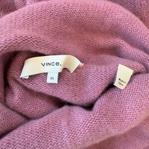Great condition, no stains, tears. Worn 2-3 times total and washed once per directions. Close up pictures show true colors, a mauve/dusty purple color. Size XS, Vince. 100% cashmere. See photos for measurements.