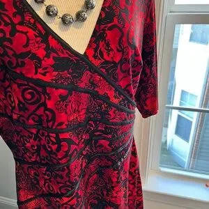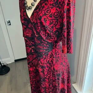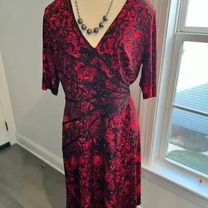 Perfect travel dress doesn’t crease with flattering elbow length sleeves and waist defining detail. Slightly below knee length. Easy to dress up or down. Unlined. Clean and from a smoke free home. Next day shipping on all items.