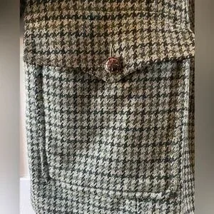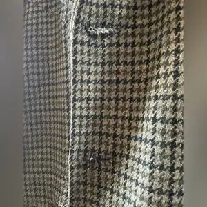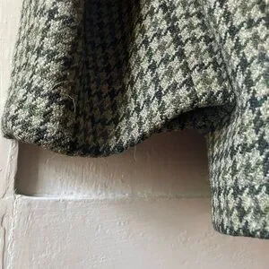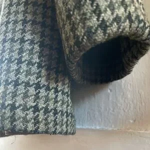 Houndstooth tweed wool outer layer in a gray, green, black color scheme