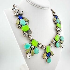 J. Crew statement necklace features a multi-colored stone design with lime green, turquoise, and clear crystals on an antique finish metal chain. The necklace measures approximately 22 inches in length (adjustable). Some slight wear to stones and chain (see photos). Overall, the necklace is in excellent pre-owned condition. Beautiful piece from J. Crew!