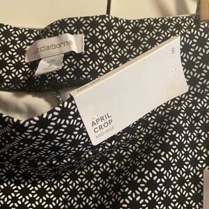 These NWT Liz Claiborne pants feature a striking geometric pattern of small white dots on a black base, creating a bold contrast. Designed in a cropped style, they offer a slim fit and are made from a smooth, 4 way stretch fabric for added comfort.