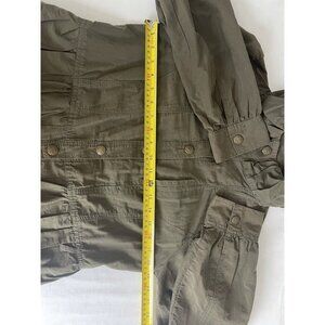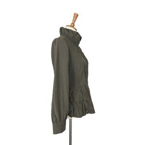 This cute jacket is a modern, feminine take on the classic green military utility jacket with it's ruffled stand-up collar and ruffles around the hip. Patterned brass snap buttons down front and on wrist cuffs.