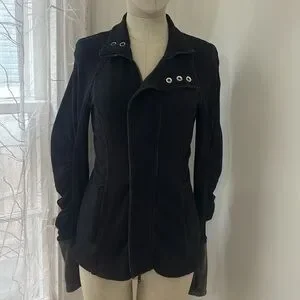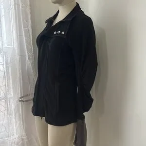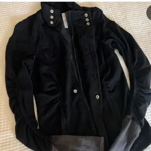 Ultra-flattering zip-up jacket featuring ruched details, thumb holes and an adjustable collar.