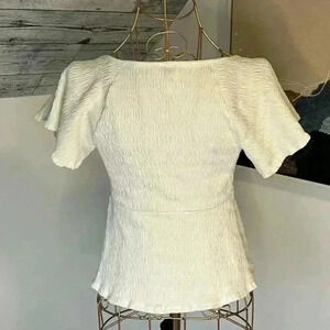 Sweet and flowy women’s tie front top with a bit of stretch available in size Small. The shirt is in like new condition and barely worn, featuring comfortable adjustable tie front, ribbed material, and peplum-like waist.