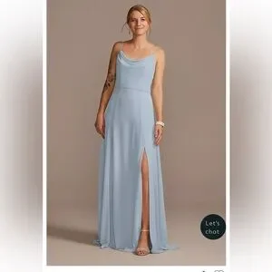 David’s Bridal Dusty Blue Chiffon Cowl Neck Bridesmaids Dress Gown with Slit