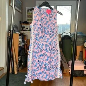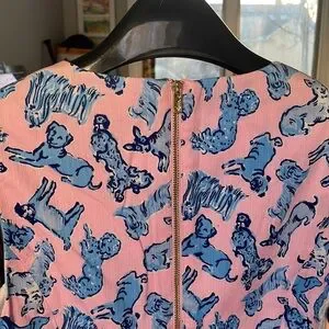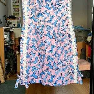 Size 0. I so desperately wanted this to fit me because the print is so CUTE. My loss is your gain. Light baby pink dress with blue dog print and white embroidered detailing down the sides. Back zip. Cute little bow details on hem also!