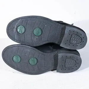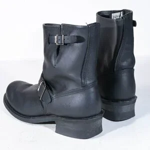 Classic round toe moto boot. Short height. Thick black leather uppers. Nickel roller buckles. Made in USA. $298 retail.