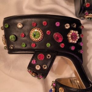 These striking 6inch platform sandals are black with colorful jewels. The high platform design includes two wide straps adorned with vibrant circular studs and flower-shaped decorations in multiple bright colors. With a chunky heel and thick sole, these sandals are perfect for making a bold fashion statement. They are lightly used and missing a few jewels. See photos.