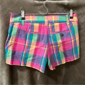 Never worn J Crew pink/multi plaid cotton shorts! Fantastic, beautifully bright colors, zip and clasp enclosure with a hidden button. No pulled threads or pilling.