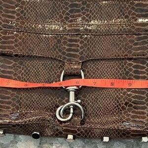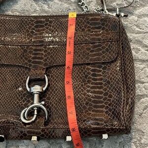 Rebecca Minkoff brown faux snakeskin crossbody in beautiful condition. Optional crossbody strap with 21" (approx) shoulder drop. Silver hardware. Fun interior lining with original zipper pull tassels (that can be removed)