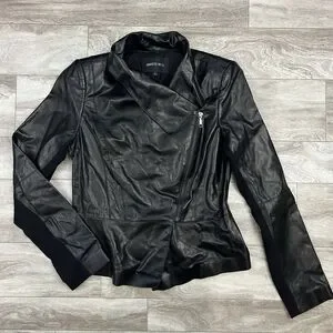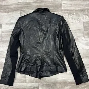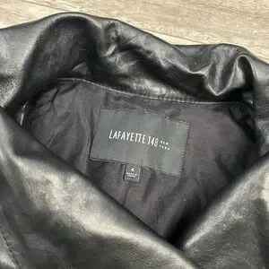 This is a Lafayette 148 New York women's Moto leather jacket in size 4. The jacket features a solid black color with a zip-up closure, long sleeves, and a short length. It is crafted from leather with a cotton lining, making it suitable for winter, fall, and spring. The jacket has a collared neckline, accented with zippers, and is designed for various occasions including travel, parties, casual wear, and work settings.