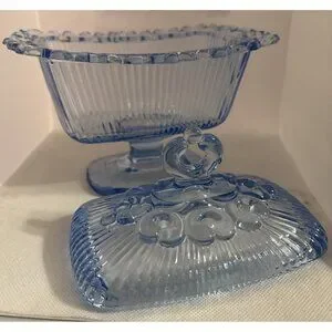 The vintage footed 5" blue candy dish and lid by Indiana Glass is a beautiful addition to any collection. Made of glass with a lace edge design and ribbed sides, this rectangular dish features a finial that matches the image on the lid. The pressed glass production style and original backstamp indicate its authenticity, while the hand wash only care instructions ensure its longevity. This elegant candy dish is a charming piece with a touch of nostalgia, perfect for displaying or serving sweets in style.