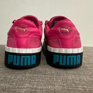 These Puma sneakers feature a vibrant pink suede upper that offers a soft textured look. The low-top design is complemented by matching pink laces and a distinctive chunky white midsole that transitions into a black outsole, providing both style and comfort.
