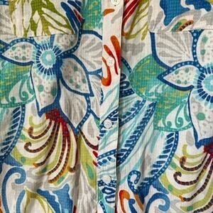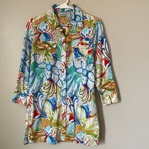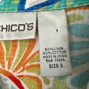 Chico's Tunic Blouse Women's XS Linen Blend Tropical Print Colorful Summer Lightweight. Button front. 3/4 Sleeves.
