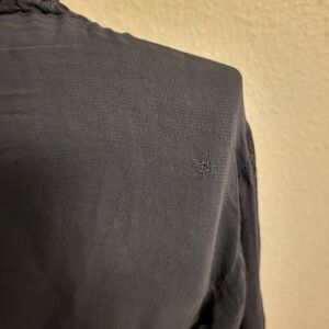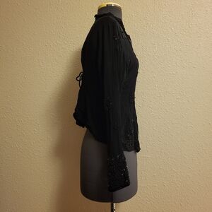 Papillon Sheer Black Beaded & Sequined Button-Up Top Size Large with center front button closures, sleeve cutouts, sleeve cuffs with button and loop closures, sleeve vents, back tie