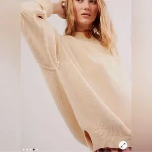 This oversized sweater features a soft cream color and a cozy cowl neckline that adds warmth and style. The long sleeves have a relaxed fit with ribbed cuffs for a snug finish, making it perfect for layering on chilly days.