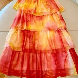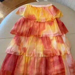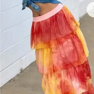 You will be as beautiful and dramatic as a summer sunset in this Eva Franco Esperanza tiered tulle maxi skirt. Gorgeous layers of tie dye oranges, yellows and pinky-peach combine for a show stopping look that embodies the warm weather exuberance we are all starting to feel! The skirt is lined in soft jersey material with an elastic waistband. Measurements: waist 13 inches, total length 33.5 inches. VGUC
