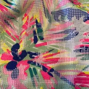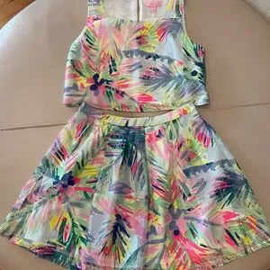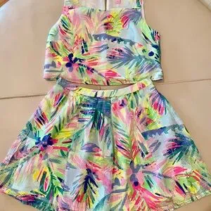Vibrant tropical print Lilly Pulitzer Hilah matching crop top and skirt set in Island Time. Both pieces are lined and have a mesh overlay in a festive print of blues, greens, pinks and yellows. The top is sleeveless and slightly cropped while the skirt is short and full. Adorable together as an outfit but each piece could also be worn on their own for a different look. VGUC. Measurements: top- pit to pit 16.5 inches, total length 16 inches skirt- waist 13.5 inches, total length 15.5 inches. Would prefer to sell as a set.