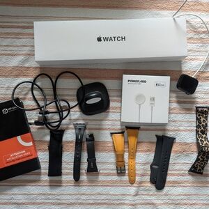 This lot comes with the Apple Watch SE, its original charging cord, a spare charging cord, a charging station, its original plastic wristband, two stretchy wristbands, two leather wristbands, and a kit with two glass screen protectors.