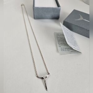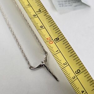 This exquisite necklace showcases a sleek silver pendant designed in the shape of a stylized human figure with outstretched arms, embodying a modern and minimalist aesthetic. It is elegantly suspended from a fine link chain, enhancing its sophisticated appeal. The combination of silver and gold tones adds a unique touch to this striking jewelry piece.
