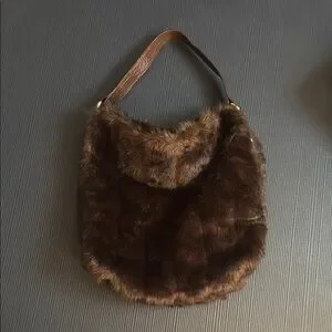 This stylish tote from Bath & Body Works features a soft plush texture and a unique crescent shape. The bag is predominantly brown with variations in shade, offering a cozy and inviting look. Its single leather strap adds a touch of elegance, making it a perfect accessory for any occasion.