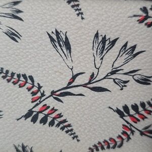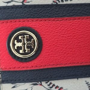 Elegant Tory Burch wallet with floral design. Features a bold red stripe and black accents. Approximate measurements