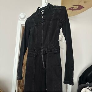Stylish black denim jumpsuit perfect for any occasion. Features a sleek design for a modern look.