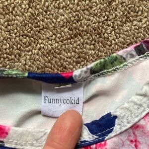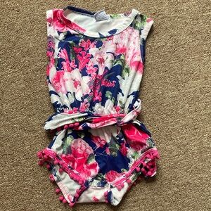 Adorable floral baby onesie. Features vibrant pink and blue floral patterns. Cute pom-pom details on the edges and matching belt.