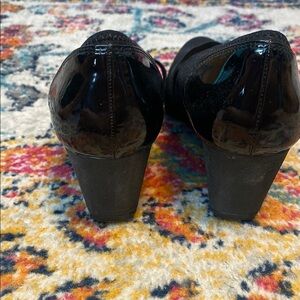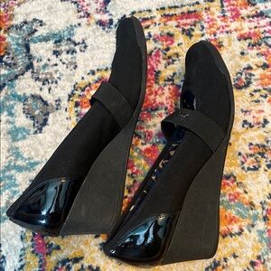 I have chronic foot issues, which is why I’m getting rid of a lot of my shoes! I hate to see these go because I remember searching all over for something comfortable to wear to a dressy occasion. Wedge styling, comfort upper with elastic strap across the toe. Patent accents give the stretchy fabric a dressy feel! I only wore these a couple of times as shown in the photos of the souls. Please ask me any questions!