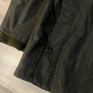 Great used condition! The marks are from not being waxed or worn in a while and hanging in a closet. The marks will disappear after being rewaxed, which is recommended to do once a year. To keep the Sage color consistent and the jacket waterproof.