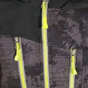 Stylish children's jacket with a black and gray camo pattern. Features neon yellow zippers and accents. Perfect for outdoor adventures. Lightweight, perfect for spring and fall. Size 10/12.