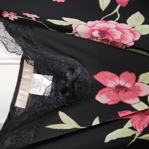 Elegant black slip dress with pink floral design. Perfect for a comfortable and stylish night in.
