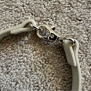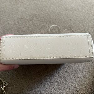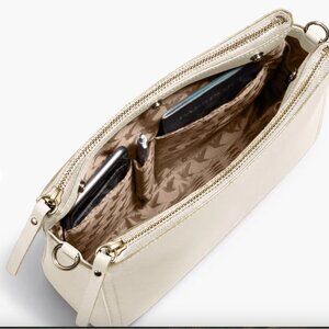 Ivory saffiano leather, gold hardware, A stylish yet functional crossbody bag made from premium leather that seamlessly converts to an adjustable length shoulder bag or large clutch. Features tons of pockets 2 inside that zipper shut) to accommodate a mini tablet, phone, wallet, and essentials for life on the go.