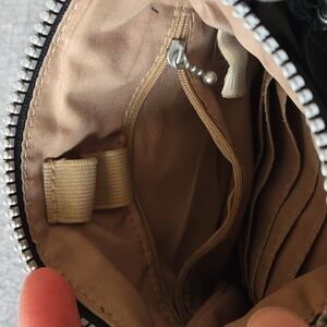 small black baggallini purse with 3 pockets. largest compartment has card slots, pen loops and inner zipper pocket. adjustable strap. measures approximately 7 inches by 6.5 inches, see photos.