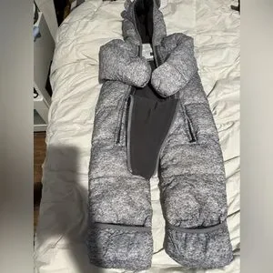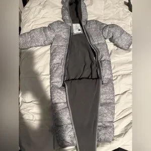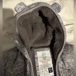 100% Recycled ColdControl Max Puffer One-Piece by Baby Gap. Perfect for winter and outdoors. Sleeves and legs have cuff to keep lil ones hand and feet warm. Double zipper closure and warm faux sheep lining. Grey color. EUC