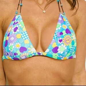 NEW! Beautiful beaded bikini. Super cute beaded blue floral bikini. Flirty beads adorn the straps on the top and bottom. Multi colored flowers and hearts cover the bikini. Straps tie at neck halter style. Medium coverage.