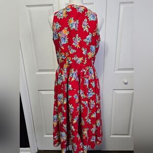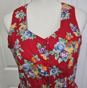 Retro colorful floral red sleeveless dress with button down closure and fitted waist.