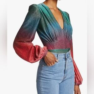 The PatBO Sunset Lurex Bodysuit in size medium is a multicolor blouse designed for women. It features a V-neck and long sleeves, crafted from Lurex material with an ombré design. This solid pattern blouse is suitable for party or cocktail occasions, especially during the fall season. Made in Brazil, the item is pre-owned but in like-new condition, having only been tried on. Keywords: PatBO, Sunset Lurex, bodysuit, multicolor, V-neck, long sleeve, ombré, party, cocktail, fall fashion, women's blouse, medium size, Brazil, pre-owned, like new.