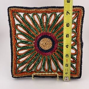 This listing is for one woven raffia (wicker) multi-color square trivet. It is approximately 7.25 inches square. In excellent condition. It is functional and will protect your tabletop from hot serving dishes or can be used as a wall hanging in your kitchen. Lightweight.