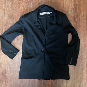 The perfectly tailored, feminine silhouette is inspired by the traditional blazer. This classic jacket features a soft stretch twill, single button closure and double vent in the back for a flattering fit on all sizes. Slightly oversized, this jacket will quickly become the most versatile piece in your wardrobe. Front flap pockets.