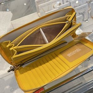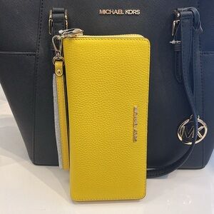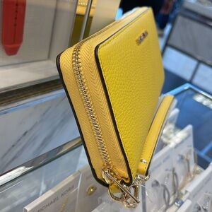 Stylish and vibrant, this Michael Kors wristlet wallet in yellow is perfect for on-the-go convenience. Crafted with quality and elegance, it adds a pop of color to any outfit.