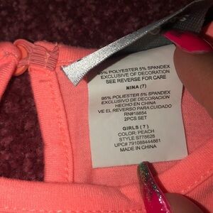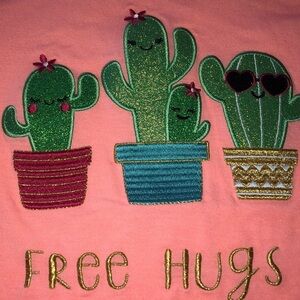 Girls bright orange short sleeve shirt it’s super cute it says free hugs in gold it has cactus and the other colors are green blue black gray and silver