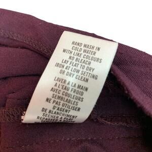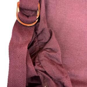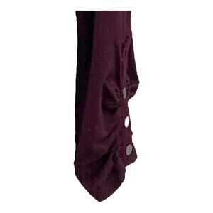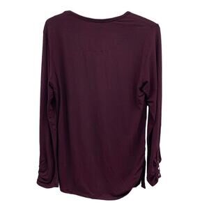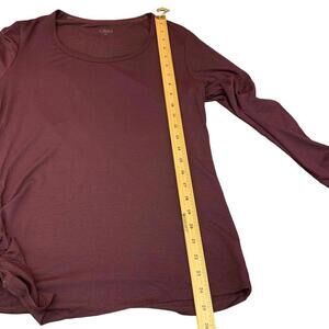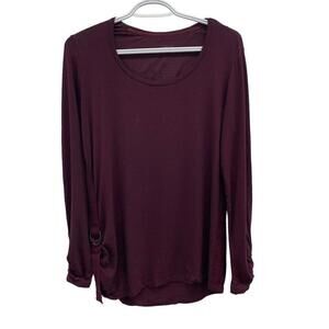 This Cleo burgundy top is a stylish addition to your wardrobe. Made from a soft and stretchy blend of rayon and spandex, this long sleeve top features a ruched side with buckle accent for a flattering and trendy look. The round neck and solid pattern make it a basic piece that can be dressed up or down. This pre-owned top is in great condition and is perfect for any occasion. Available in size M.