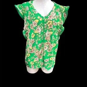 Brighten your wardrobe with this vibrant green floral top. Perfect for any occasion. p2p 23" length 25 1/2" 99% Polyester 1% Spandex size LG NWT
