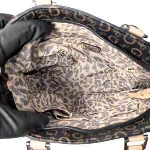 1. Guess black signature PVC and faux leather mini satchel with silver-tone hardware. Very good condition with minor wear. No rips, tears or stains. Missing crossbody strap. Lined interior has zip closure & 3 slip pockets.