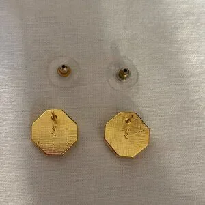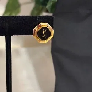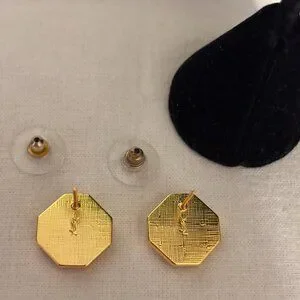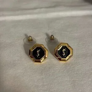 These beautiful Yves Saint Laurent earrings are a must-have for any fashion-forward individual. The pierced studs feature a stunning combination of gold and black, with the YSL logo prominently displayed. The earrings come with a YSL pouch for safekeeping. They are perfect for adding a touch of elegance to any outfit.
