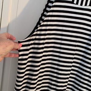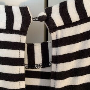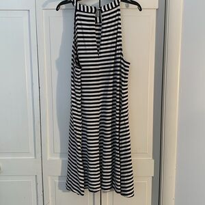Chic midi dress with bold black and white stripes. Sleeveless design. Perfect for casual outings. Features a high neckline with button & keyhole on back.