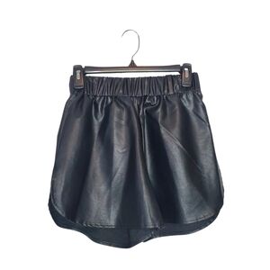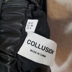 Collusion sold by ASOS. Faux leather shorts in black with curved hem. High waist.