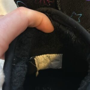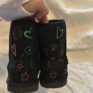 Children’s Place Ugg-style girls black boots with vibrant multi color doodle accents (emojis, flowers, peace signs, etc). Little girls size 13. Comfy and cozy fleece inner lining. Barely worn and in excellent pre-owned condition. Perfect for adding a pop of color and sass to any outfit! This style is no longer available online.