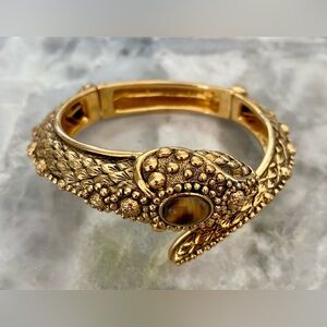 Roberto Cavalli leopard print wristlet clutch with a chic gold snake bracelet that is removable. The bag measures 8” x 5”. The width of the bracelet is 2 1/4 inches. Extremely light wear from use in excellent condition and smoke free home. Perfect for adding a touch of wild elegance to any outfit.